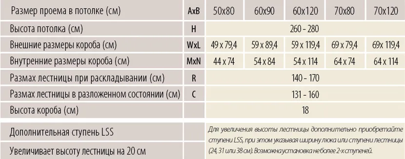 Для увеличения высоты лестницы дополнительно приобретайте ступени LSS, при этом указывая ширину люка или ступени лестницы (26, 31 или 38 см). Возможна установка не более двух ступеней. Монтажный комплект LXK поставляется в комплекте с лестницей.