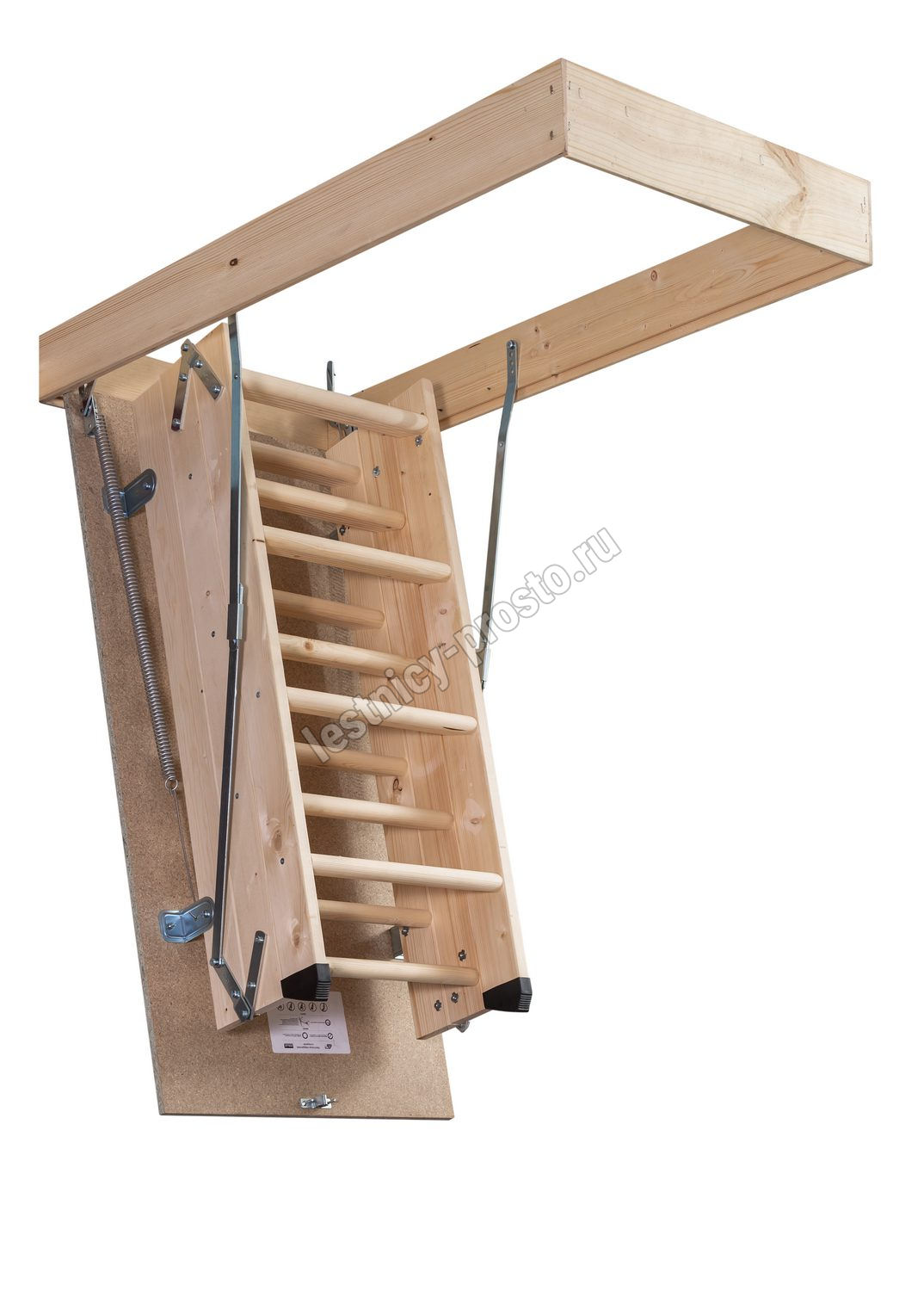 Обеспечивает легкий, комфортный подъем на верхние этажи частных домов, загородных коттеджей и дач. В изготовлении лестницы используется дерево хвойных пород. Лестница оснащена люком из водостойкого ДСП, который можно перекрасить в подходящий для интерьера цвет.