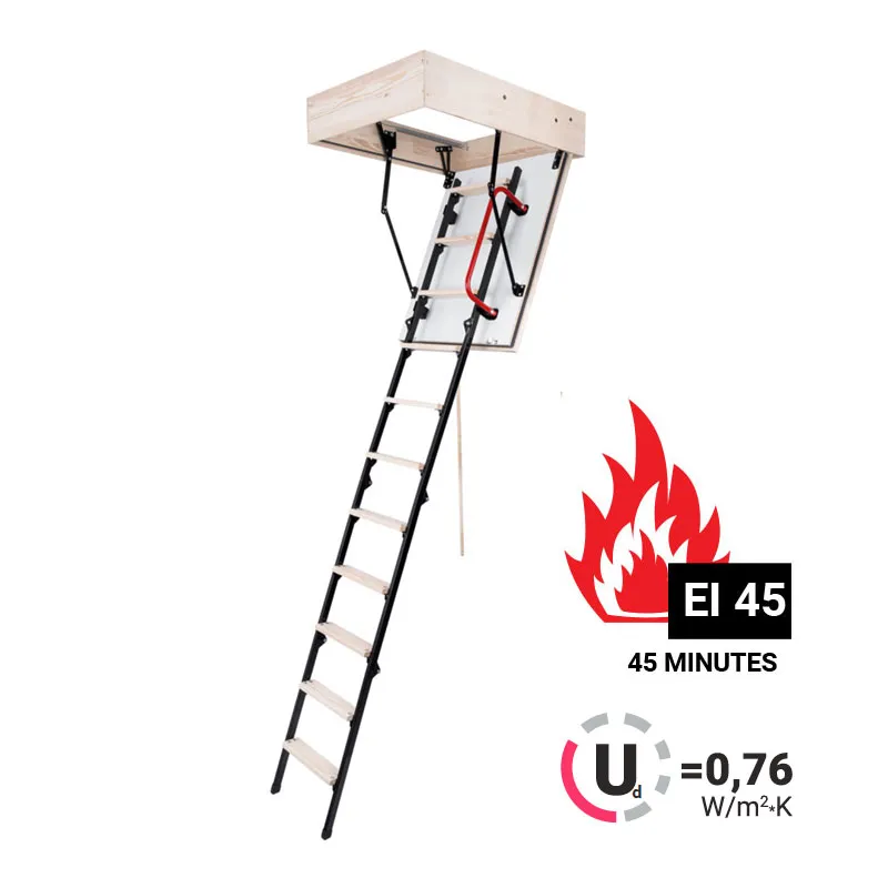 Лестница идеально подходит для установки в помещениях  подверженных риску возгорания, её противопожарные свойства позволят эффективно изолировать помещение, в котором возник пожар, от чердака, тем самым предотвращая дальнейшее распространение огня. Предел огнестойкости (EI) 45 минут.