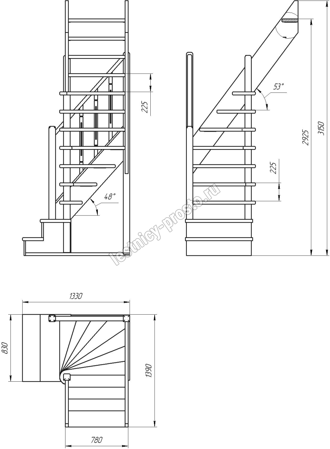 Деревянная межэтажная лестница ЛЕС-91 2925-3150 проем 1390-780, Лиственница