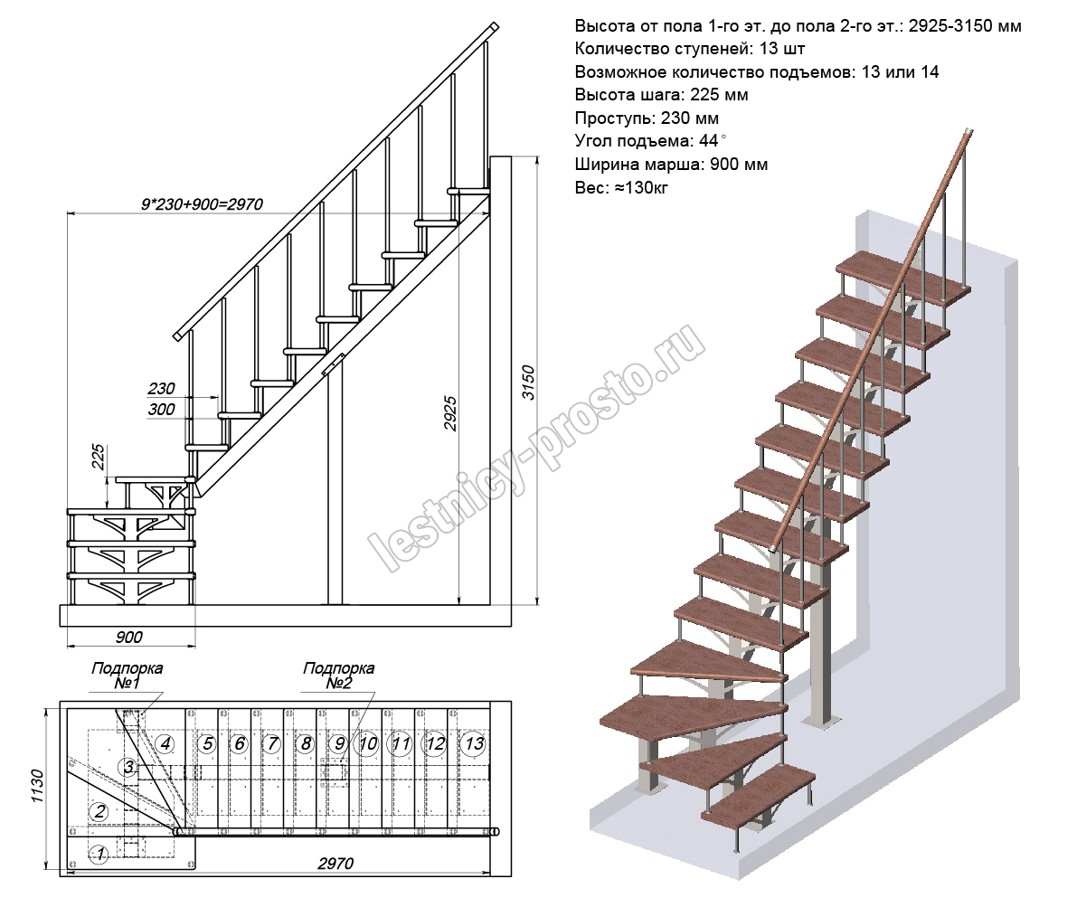 Лестница PROSTO MONO Г-образная h315 см, ступени хвоя