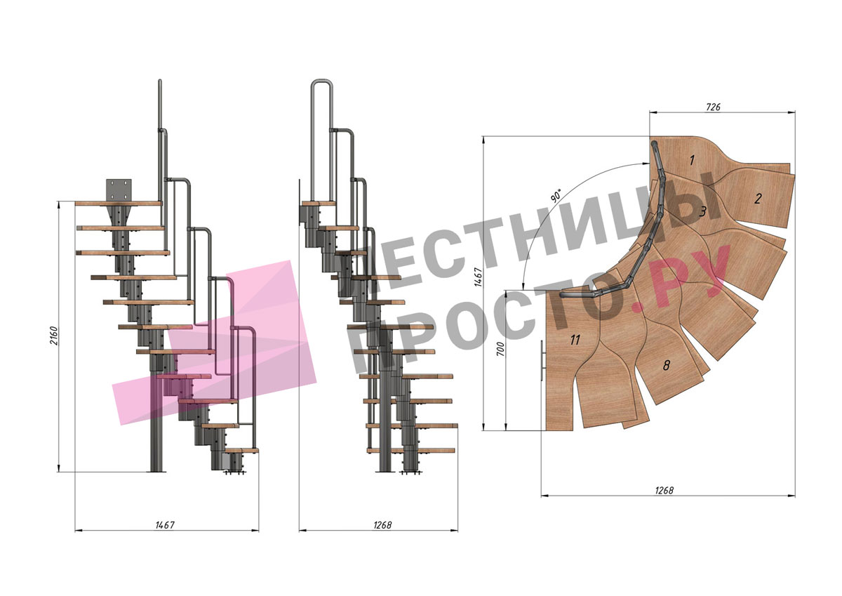 Лестница Prosto Urban Black гусиный шаг 700 мм, h198-288 см (11 ступеней), ясень