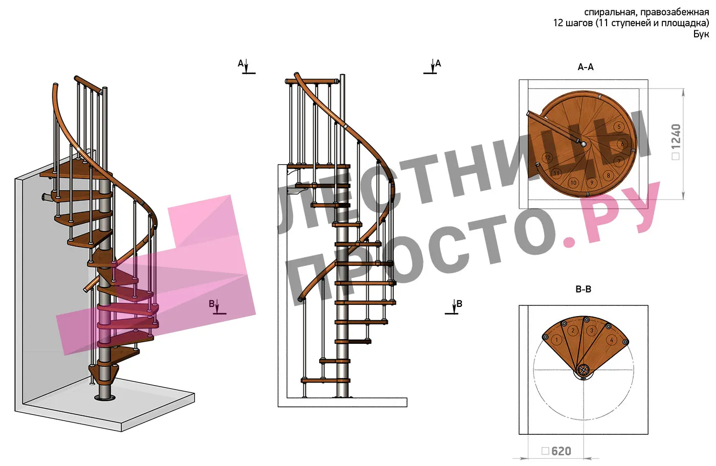 Винтовая лестница Prosto Spiral Black D120см, h260.5-304.6 см, бук
