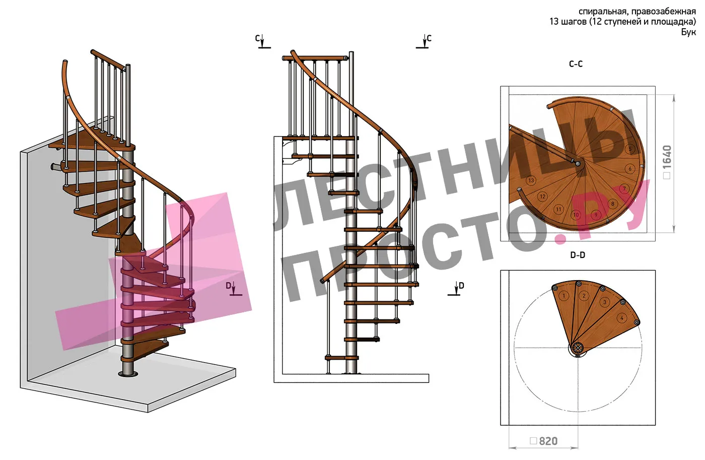 | Винтовая лестница Prosto Spiral Black D160см, h282.2-326,3 см, бук |