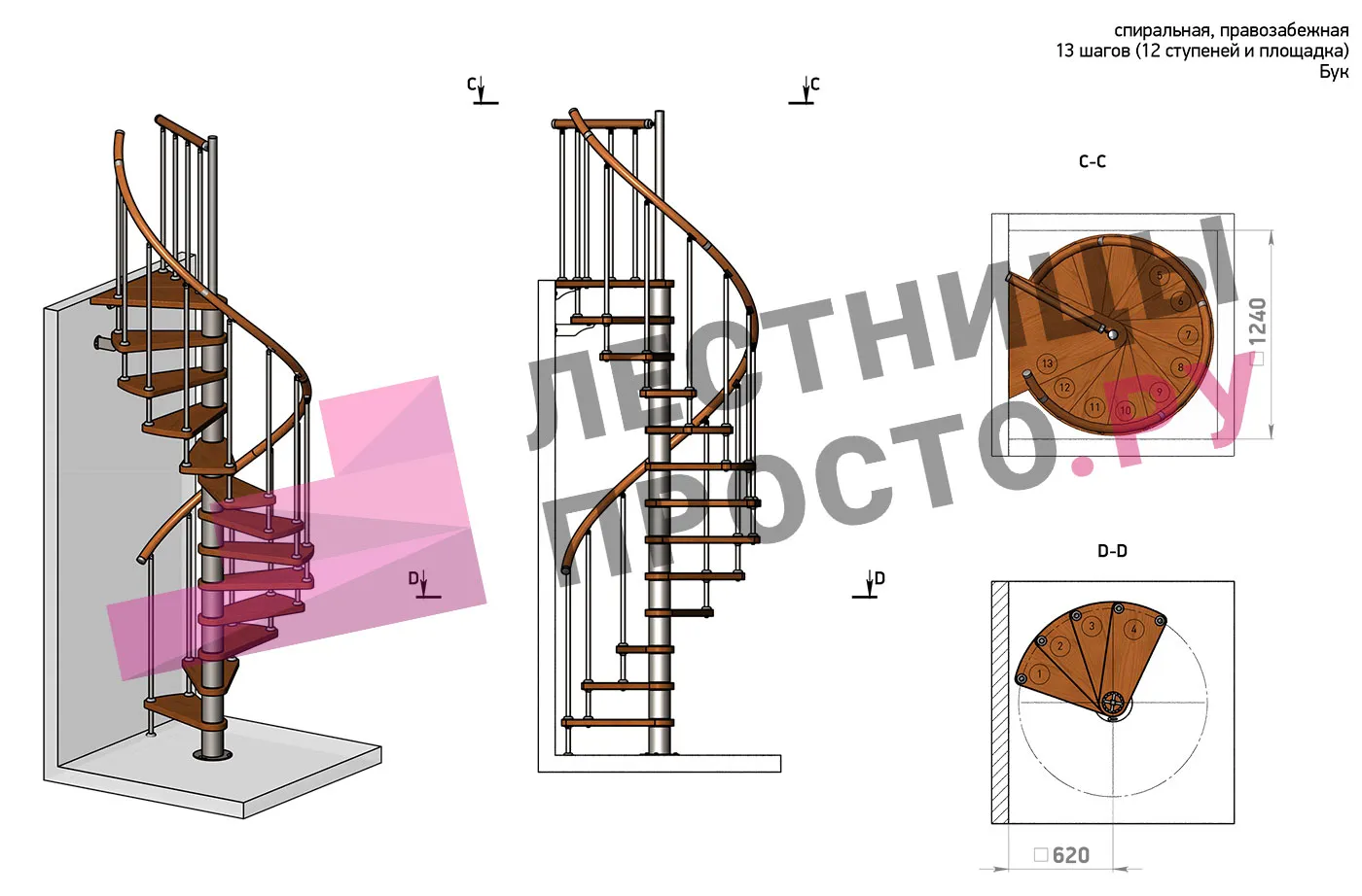 | Винтовая лестница Prosto Spiral Black D120см, h282.2-326,3 см, бук |